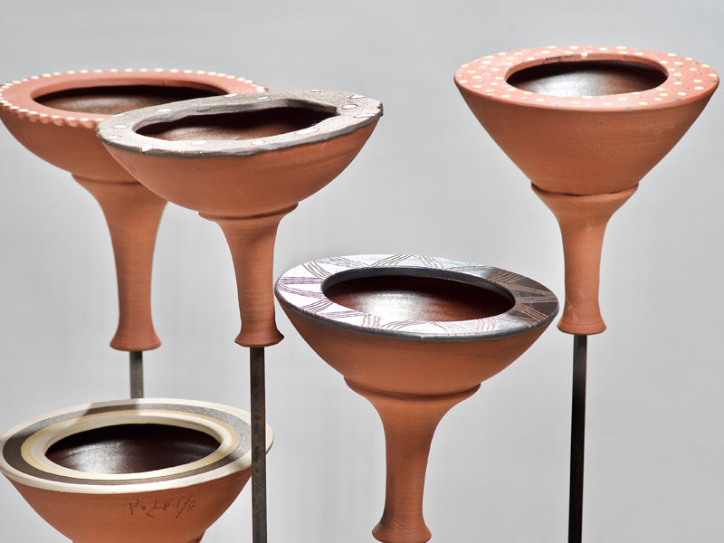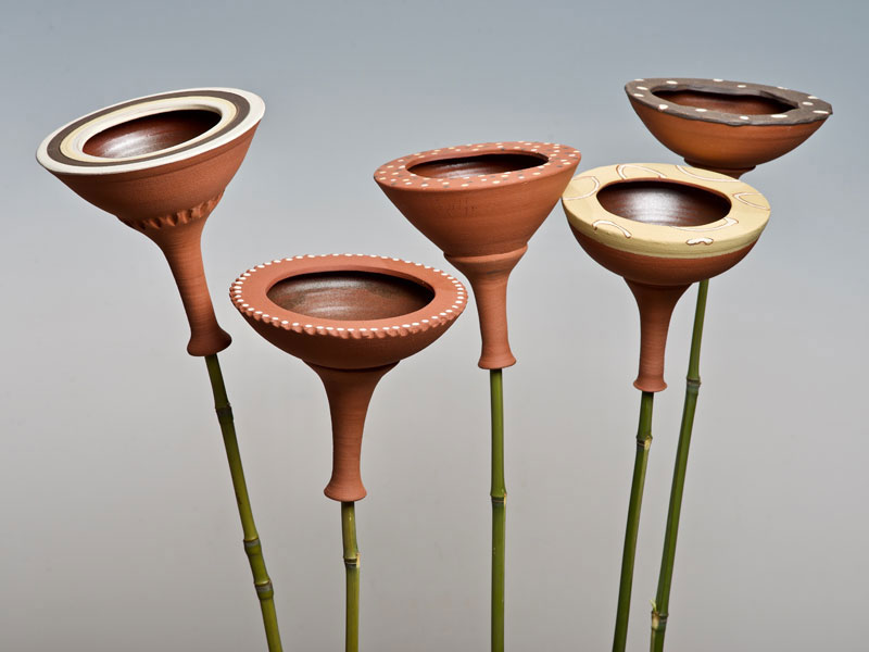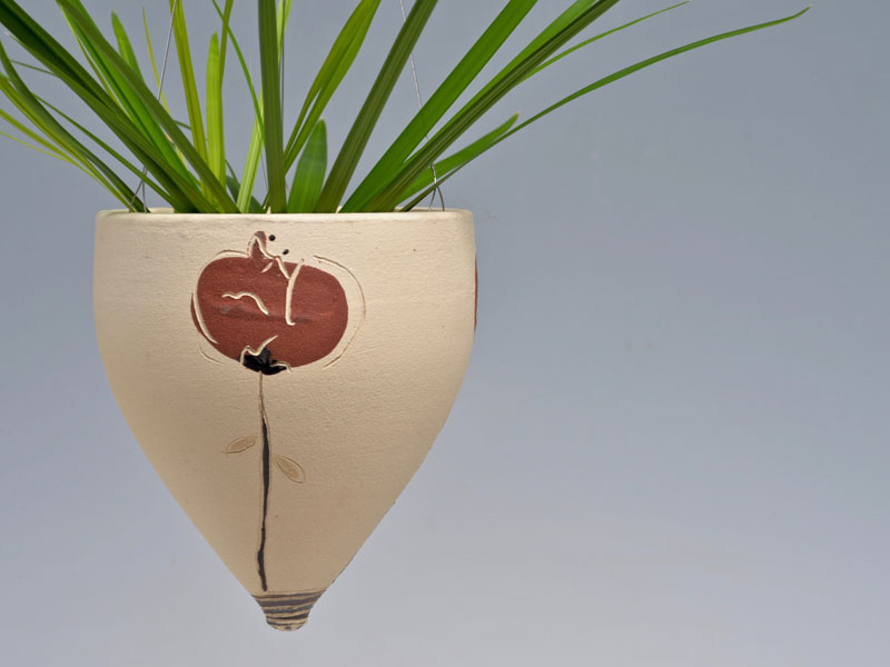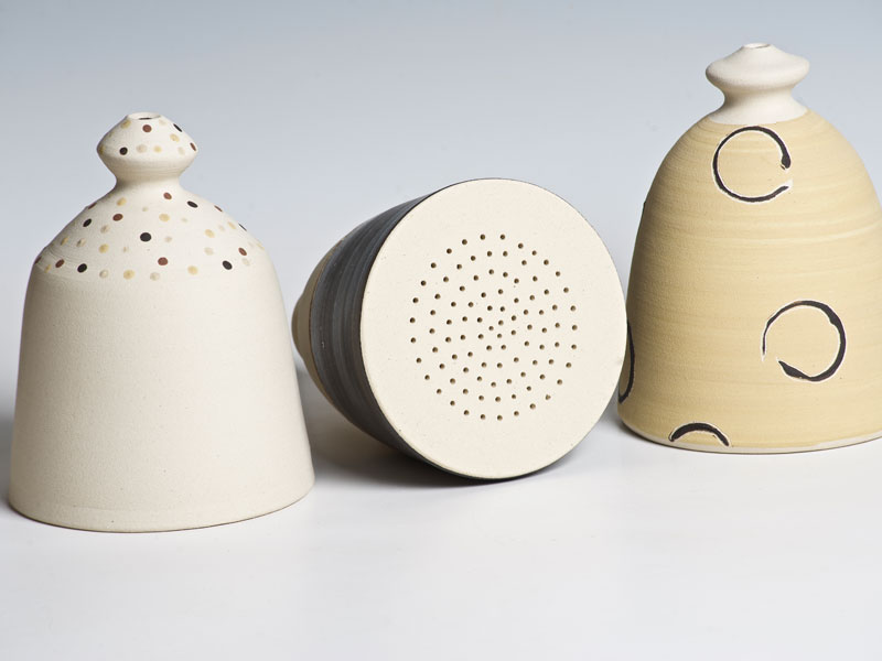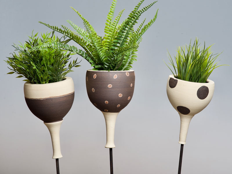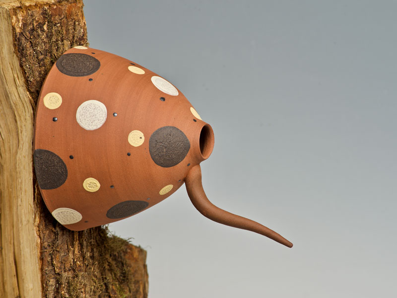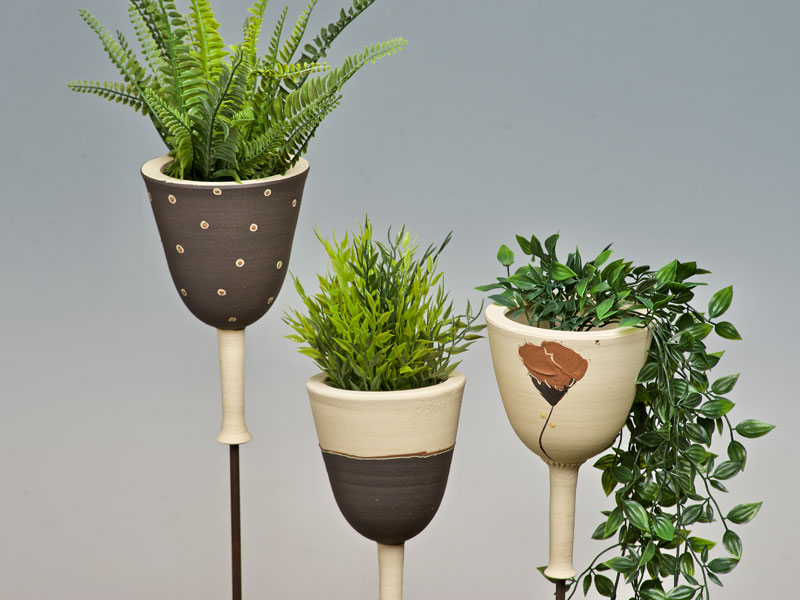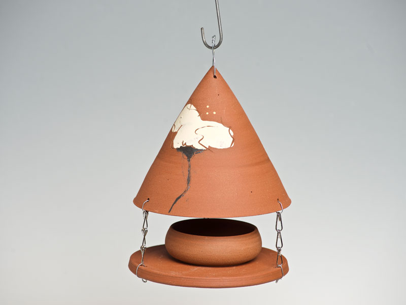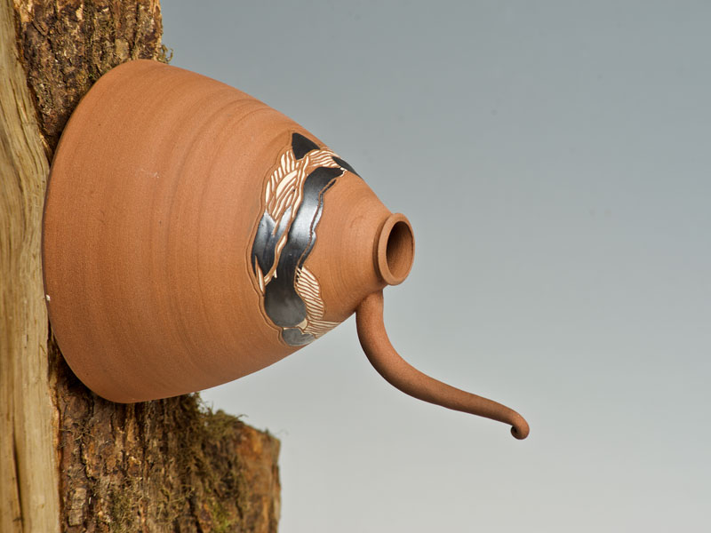 Nichoirs, mangeoires, abreuvoirs pour les oiseaux, supensions de plantes, arrosoirs Chantepleures, déco-tuteurs,... pièces en grès non gélif aux décors aux engobes naturels